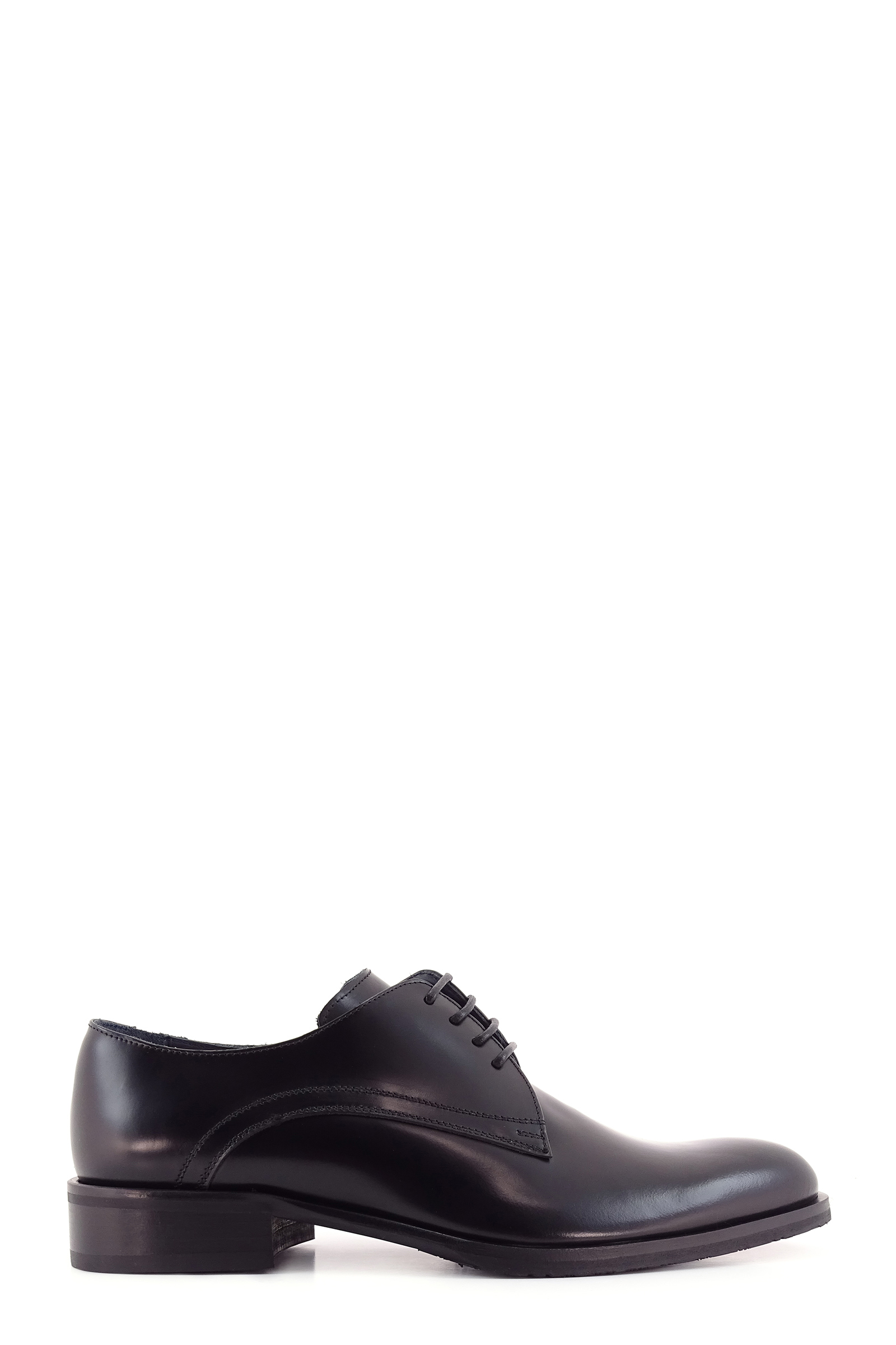 Stringate in pelle abrasivata nera, allacciatura derby, fondo in cuoio con gomma personalizzata.